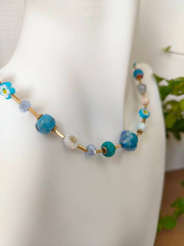 Met deze prachtige stainless steel ketting zul je iedereen verbazen. Deze kettng geeft jouw look een touch of blue. Verschillende soorten kralen en natuurstenen maken deze ketting tot een uniek sieraad.