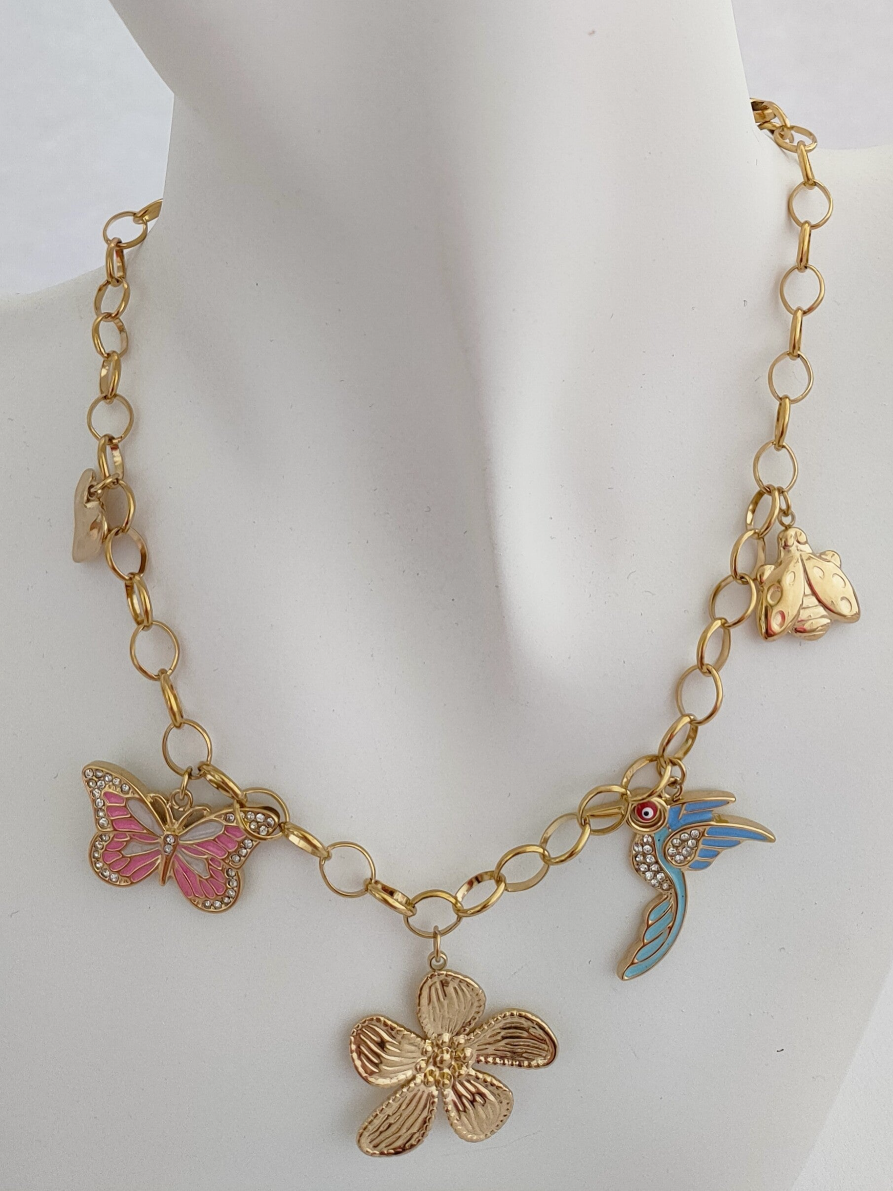 Prachtige stainless steel ketting met bedels. Deze zomer komt deze eyecather zeker tot zijn recht. Draag deze stainless steel ketting met een mooie witte blouse en spijkerjasje of, met een lange jurk met een mooie blote hals.